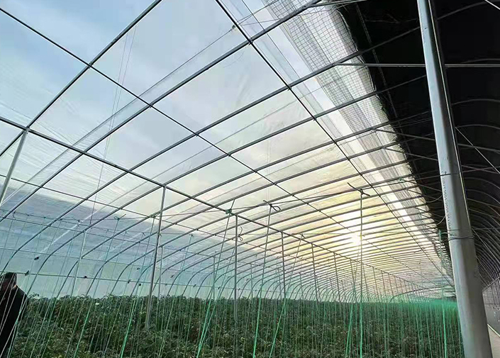 在夏季,由于進(jìn)入溫室的太陽輻射熱負(fù)荷太高,溫室雖然經(jīng)過通風(fēng),但溫室內(nèi)的高溫、低濕環(huán)境對植物的生長還是不利的。當(dāng)使用外遮陽系統(tǒng)時(shí),由于阻隔了部分太陽輻射進(jìn)入溫室,在具有良好通風(fēng)的溫室中可將室內(nèi)溫度控制到只比室外氣溫高1度的水平。托、壓幕線采用高強(qiáng)度黑色uv聚酯線,遮陽網(wǎng)采用外遮陽幕布,遮陽率85%,保質(zhì)期5年,壽命10年。整個(gè)系統(tǒng)限位準(zhǔn)確,運(yùn)行平穩(wěn)可靠,操作安全。